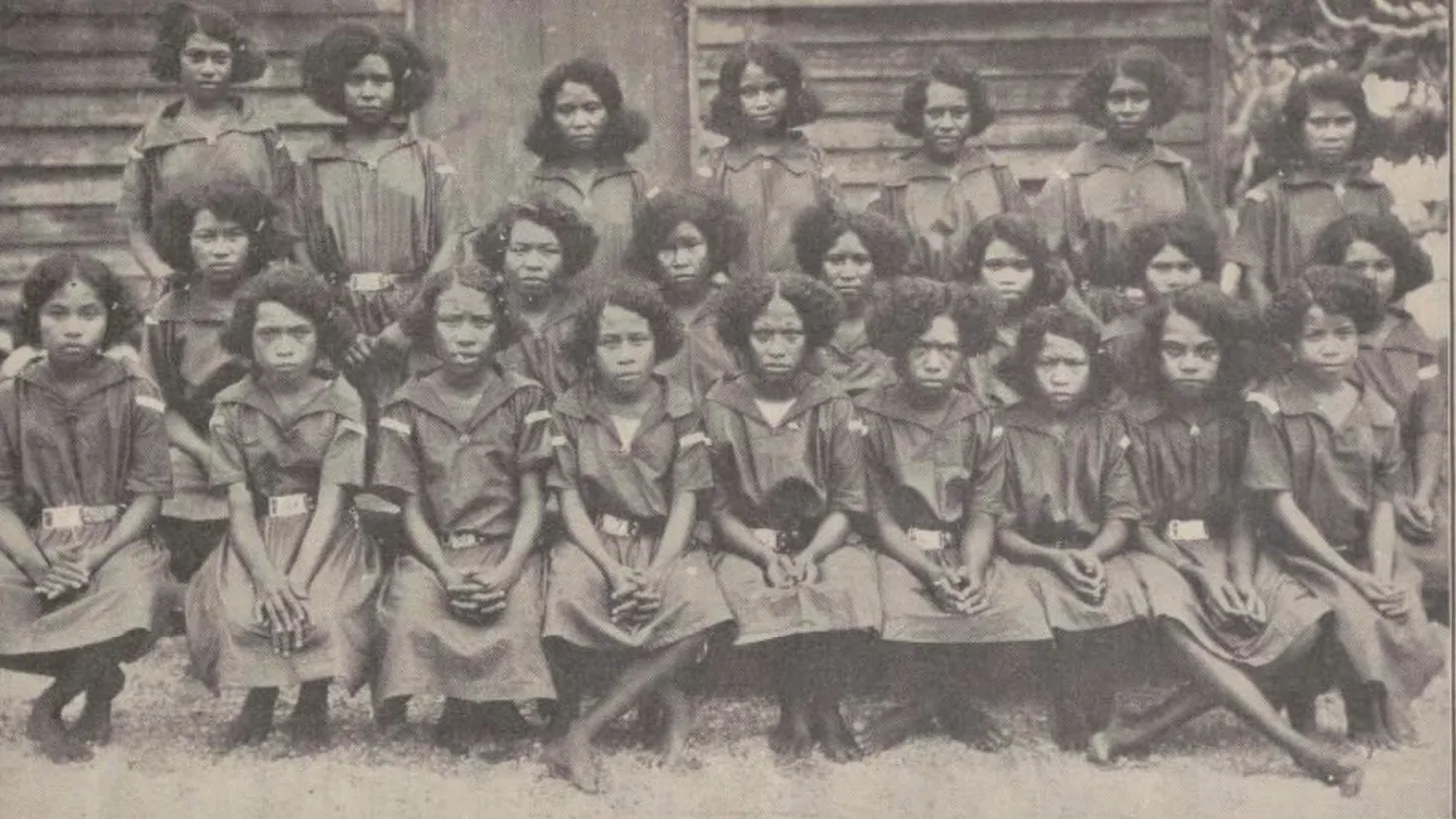 This photograph captures the first group of girls to join the Girl Guide movement in Papua in 1926, established by Mrs Chatterton. Four patrols were formed, each named after native birds: Pune, Kaubebe, Koki, and Bisini.